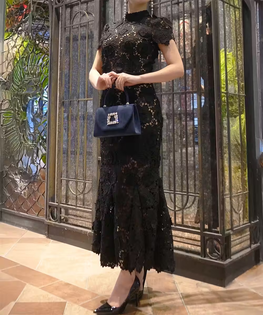 🖤 レースの立体感が映える、品よく華やかなブラックドレス クラシカルなディテールと女性らしいシルエットが魅力。