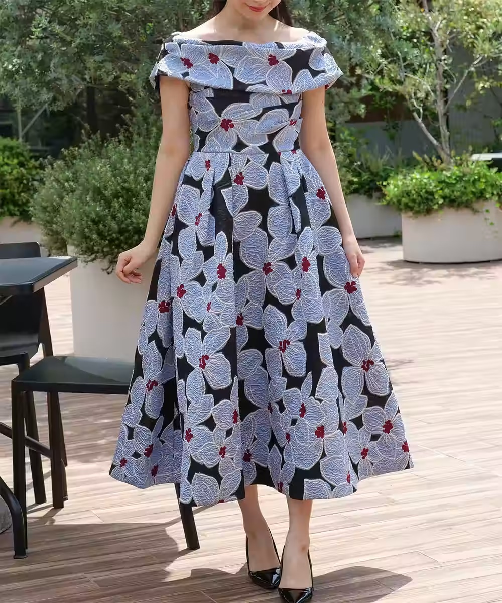 立体的なフローラルブロケード×オフショルダーの組み合わせで、 華やかすぎず、でも確実に印象に残る一着。