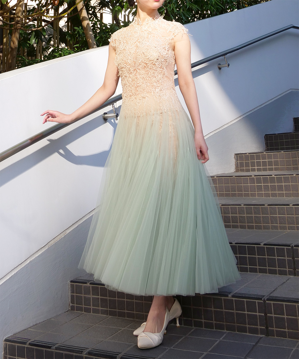✨ミントグリーンの柔らかなグラデーションが美しく広がるチュールドレス。